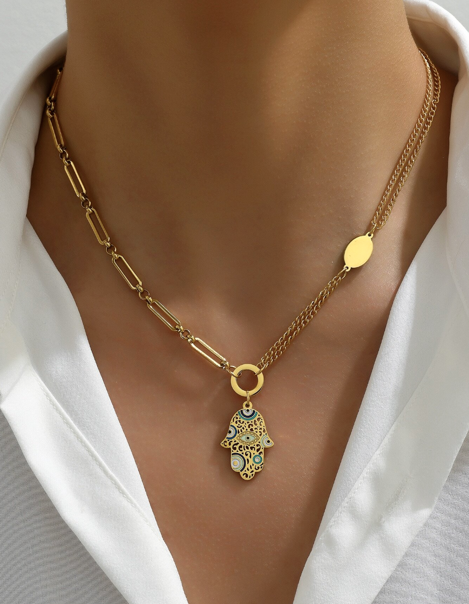 Collar Dorado de Acero Inoxidable con Dije de Mano de Fátima: Protección y Estilo en Perfecta Armonía