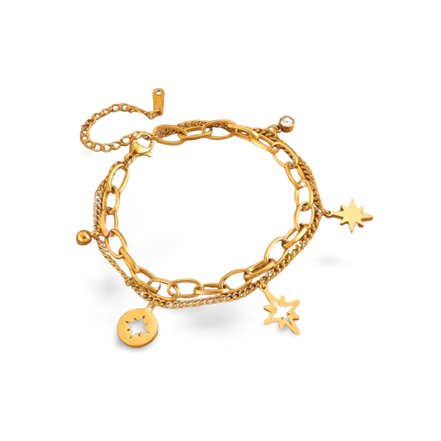 Su diseño con dijes de estrellas no solo añade un detalle encantador, sino que también simboliza la conexión con tus sueños y aspiraciones. La doble cadena realza su apariencia, brindando un acabado dinámico que aporta profundidad a cualquier conjunto, ya sea casual o de gala.