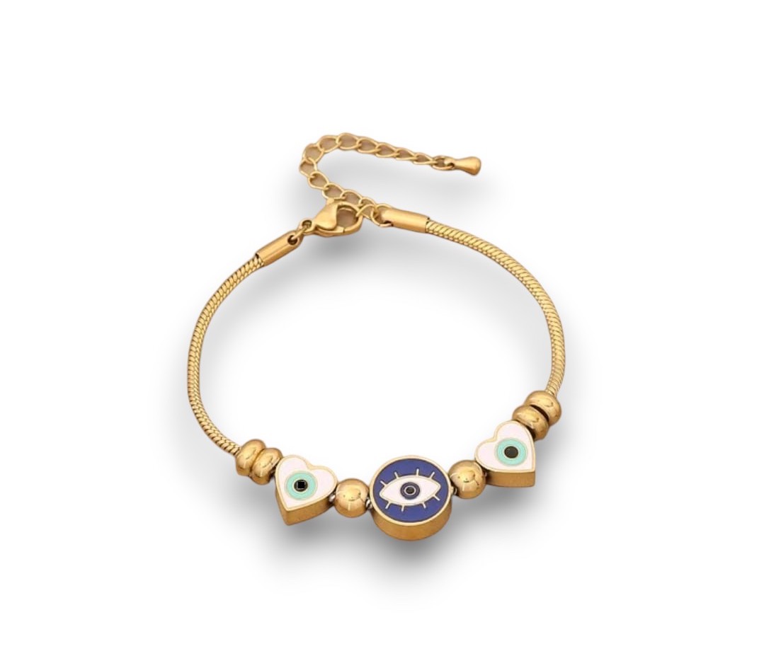 *3 cuentas de ojo turco por un lado y por el lado de atrás son completamente doradas: 1 cuenta redonda y plana en azul (centro), 2 cuentas en forma de corazón en blanco y azul