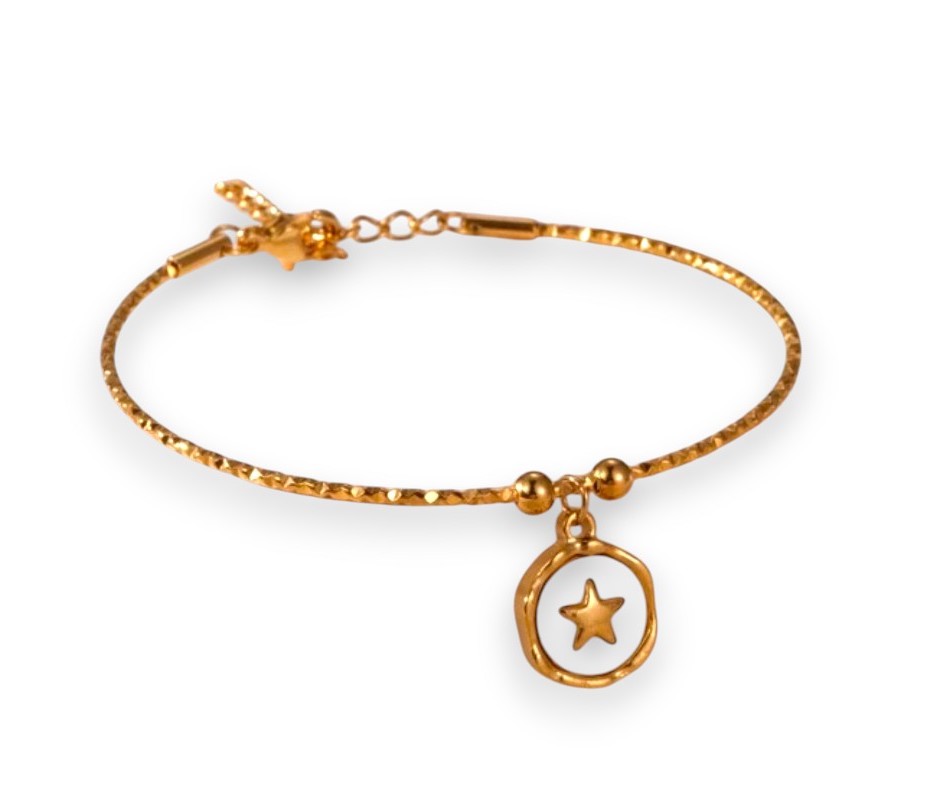 La Pulsera Dorada Dije Estrella Blanca es el accesorio perfecto para realzar tu estilo moderno y sofisticado. Confeccionada en acero inoxidable de alta calidad, su acabado metálico aporta un brillo especial que destaca en cualquier ocasión. Diseñada para la mujer contemporánea, esta pulsera evoca un aire glamoroso que complementa tanto atuendos casuales como elegantes.